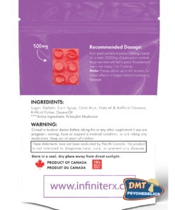Ingredients: Sugar, Gelatin, Corn Syrup, Citric Acid, Natural & Artificial Flavours, Artificial Colour, Coconut Oil, Psilocybin Mushrooms.